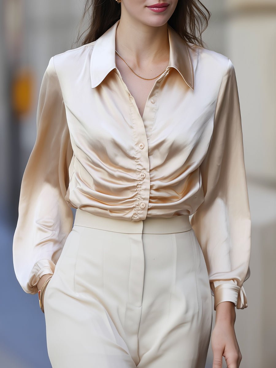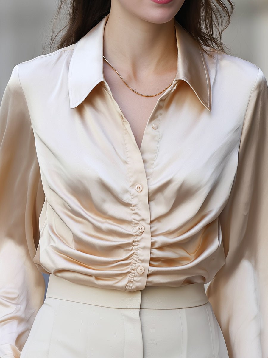 Mooyius presents the Champagne Satin Ruched Button-Down Blouse — a refined essential that brings effortless glamour to your wardrobe. Crafted from a fluid satin fabric with a luminous sheen, this blouse features delicate ruching through the bodice for a flattering, waist-defining effect. The classic shirt collar and full-length sleeves with button cuffs lend it timeless polish, while the subtle champagne hue adds softness and sophistication.Perfect for both workwear and after-hours elegance, this blouse elevates tailored trousers, midi skirts, or denim with ease. The concealed side zip ensures a smooth fit while the front button closure offers adjustable styling. Whether tucked in or worn loose, it balances structure and drape with modern finesse.