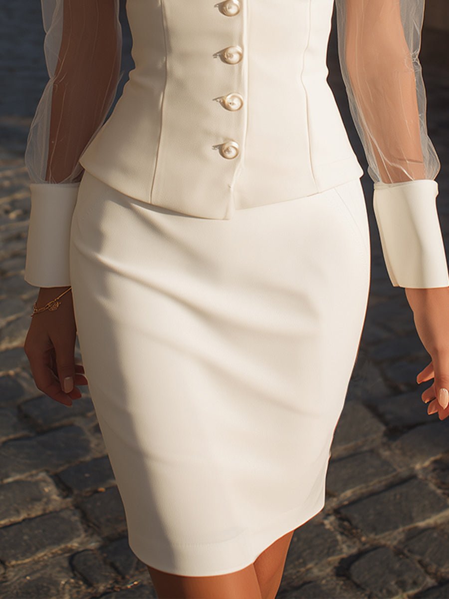 Elegant Sheer Panel White Skirt Suit With Pearl Buttons