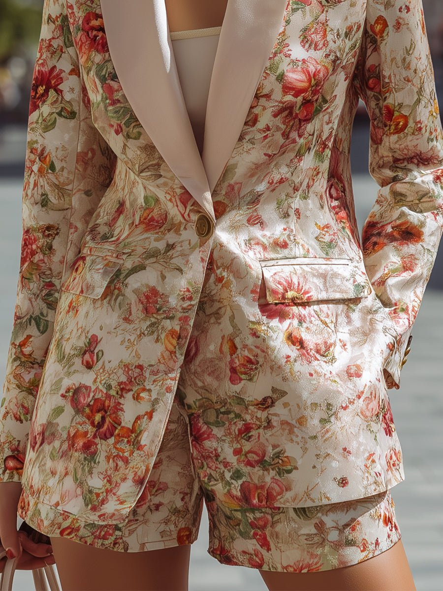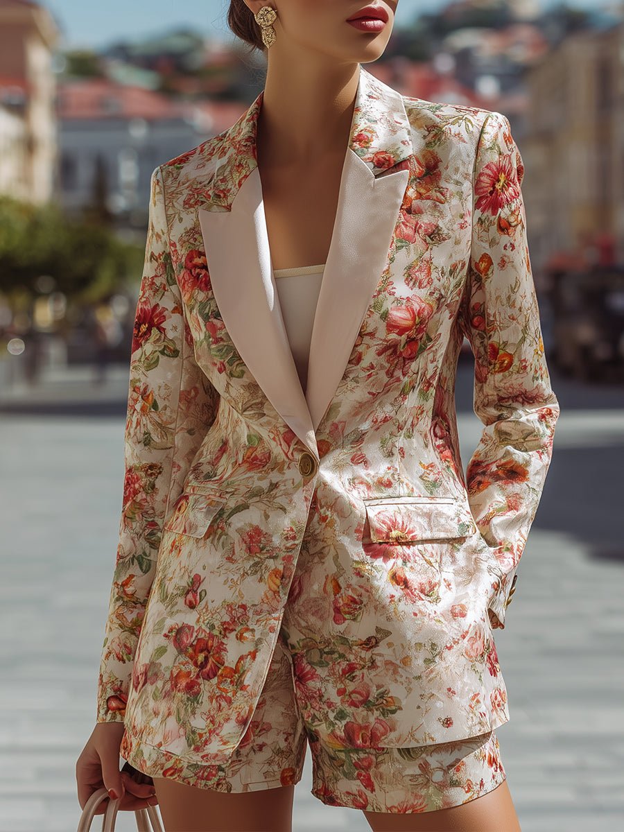 Bring fresh femininity to tailoring with this enchanting floral shorts suit. This set features a structured single-button blazer adorned in baroque-style florals and paired with matching high-waisted tailored shorts. A silk-like sheen enhances its couture charm.