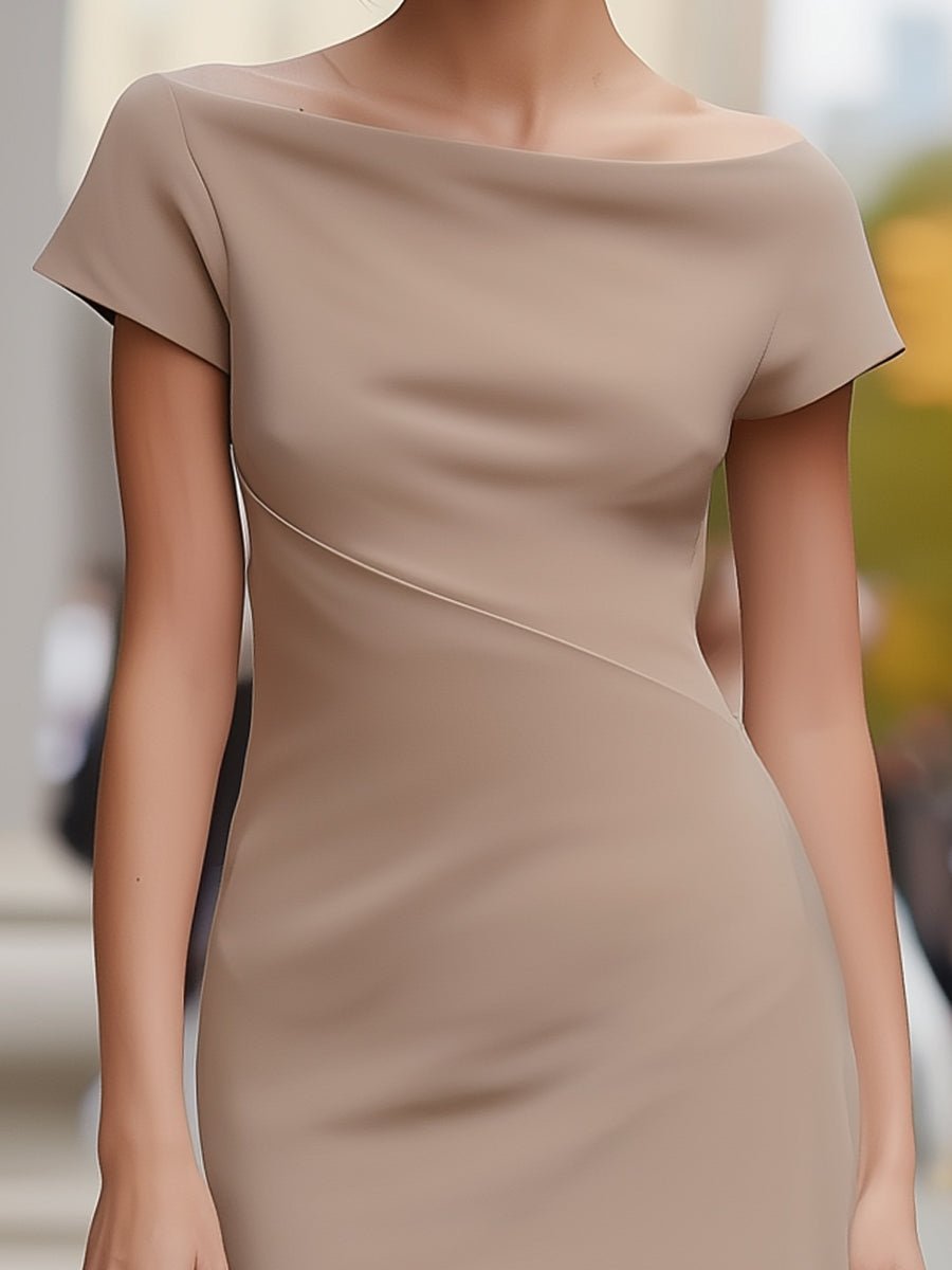 Mooyius presents the Minimalist Nude Cap-Sleeve Mini Dress—a refined statement of effortless elegance. Designed with a clean off-shoulder bateau neckline and soft cap sleeves, this dress is subtly sculpted with a diagonal seam that contours the silhouette. The body-skimming cut highlights natural curves while maintaining a polished, modern aesthetic.