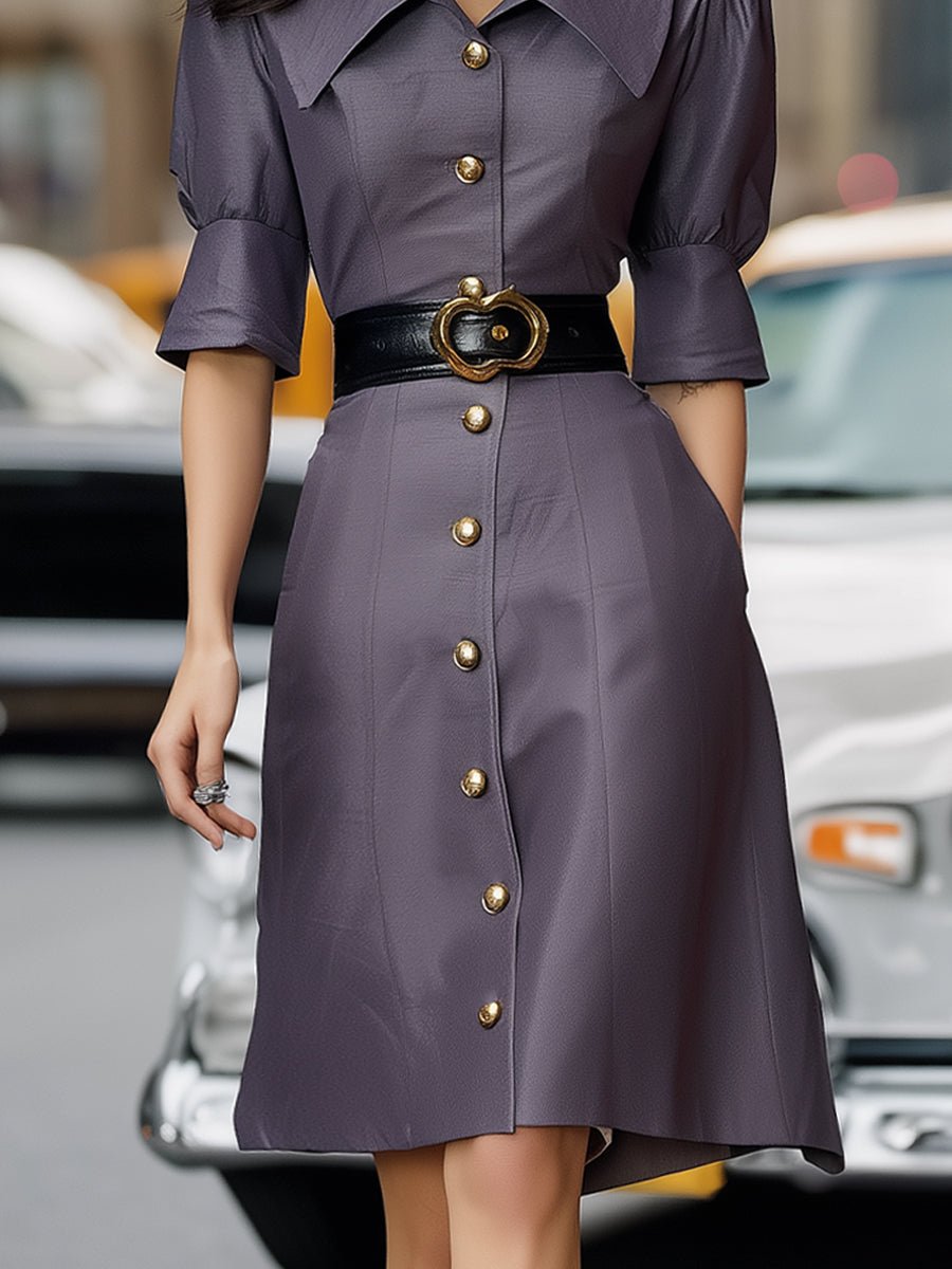 Mooyius presents the Structured Button-Down Shirt Dress — a fusion of vintage charm and urban sophistication. Crafted in a refined purple-gray hue, this tailored dress features a sharp oversized collar, sculpted puff sleeves, and a flattering A-line silhouette. The gold-tone statement buttons run down the center front, adding a luxe touch.Cinched at the waist with a wide black belt and a unique sculpted buckle, this dress creates a defined hourglass shape while maintaining comfort and movement. The mid-length cut offers versatility, easily transitioning from office to evening outings with a simple switch of accessories.
